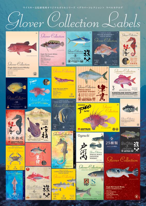 ウイスキー文化研究所のオリジナルボトルシリーズ「グラバーコレクション」のラベルを1枚にまとめたポスター!全25種類(2022年12月現在)の美しい魚譜が一度に眺められます。
