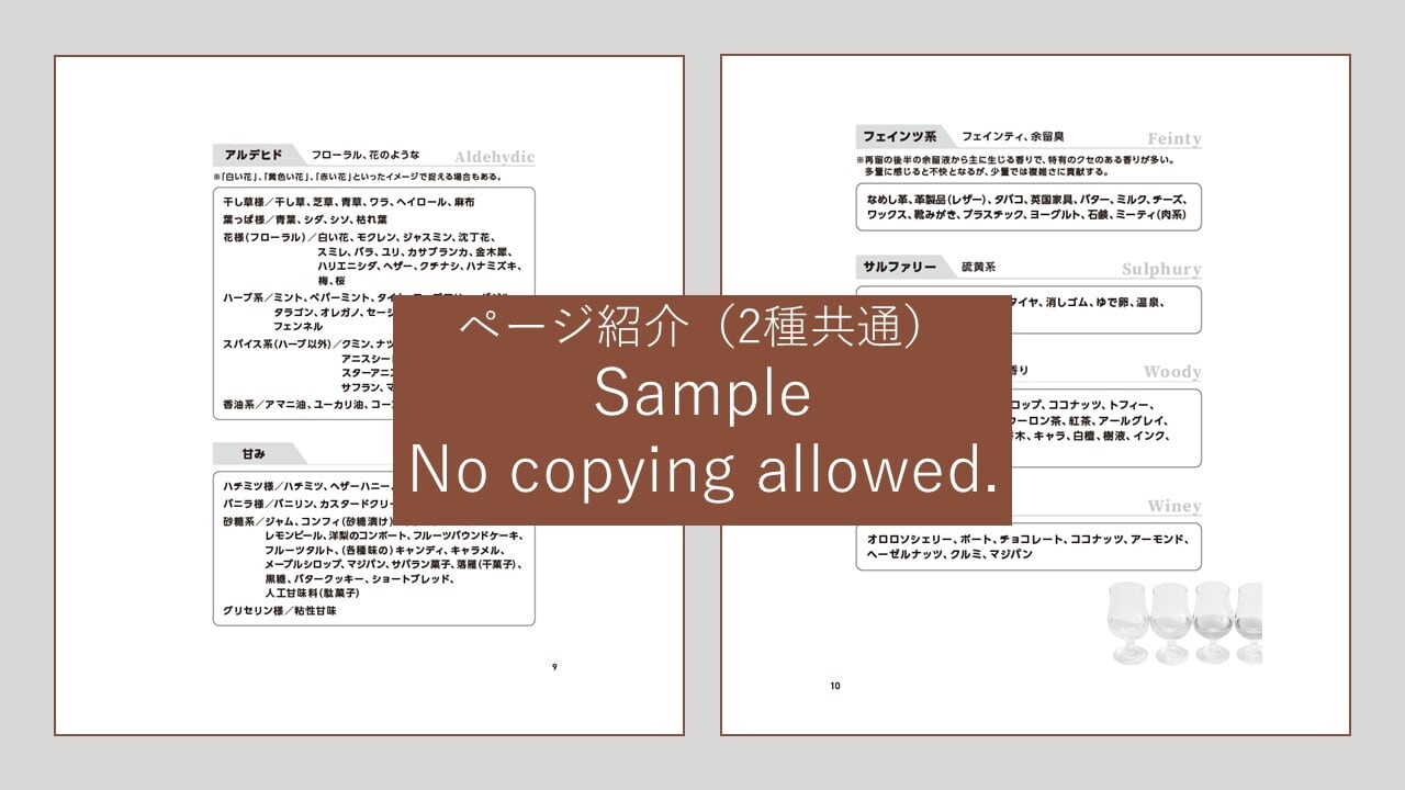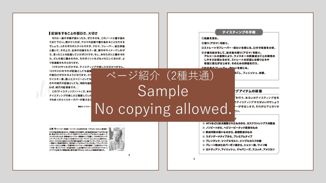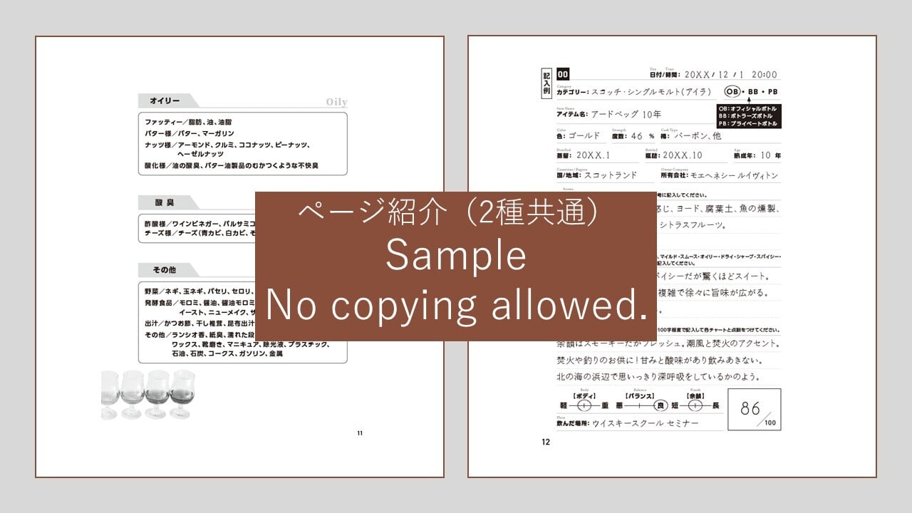 ウイスキーを軸に、ジン、ラム、ブランデー、テキーラ、焼酎、泡盛などあらゆる蒸留酒に使用できる、テイスティングノートです。このノートは、同社が主宰するウイスキーコニサー資格認定試験や東京ウイスキー&スピリッツコンペティションで収集したテイスティングの知識や技術に基づき、まとめたノートとなっています。